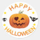 Cute Halloween pumpkin is set in the circle of Happy Halloween and a cute spider, bat and stars. This is a digital illustration.