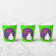 Cute ghost Halloween party paper cups in bright purple, orange and green colours. The designs are an adorable ghost holding a pumpkin basket with an orange spider pattern background. The text reads: Happy Halloween but can be change using the personalize this product button.