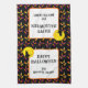 A cute, custom Happy Halloween kitchen towel with a witch flying across a full moon on a colourful pattern of candy corn in yellow, orange and purple, with grungy letters.