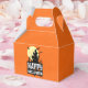 Happy Halloween text design illustration with haunted house, cemetery and bats decoration at full moon on grunge orange background