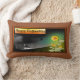 "Happy Halloween" is printed on this banner, and a haunted house is all lit up in the backround. A witch and ghost are seen flying into the night and a black cat is sitting in the graveyard. A yellow and red Halloween flower is in the front of the design. A brown backround is added to the front and back. This pillow is available in a square pillow also.