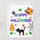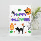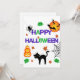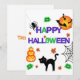 This invitation feature the words "Happy Halloween" in a spooky style print font with purple and green letters surrounded by a collection of Halloween themed decals in this spooky theme and style. Printed on a classic, all around paper 17.5 pt thickness with an uncoated matte finish with an eggshell texture made and printed in the USA with "Trick Or Treat" printed on the back.
