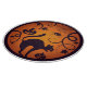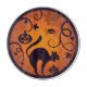 Happy Halloween circle badge with jack-o'-lantern black cat and bats typography