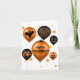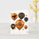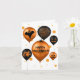 Happy Halloween illustration featuring party balloons in black and orange with a ghost, a witch, a spider and spider web and jack-o-lantern on a white background with orange dots.