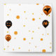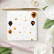 Happy Halloween illustration featuring party balloons in black and orange with a ghost, a witch, a spider and spider web and jack-o-lantern on a white background.