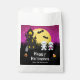 This fun and spooky favour bag features cute mummies beside a crooked haunted house. In the background is a full moon with bats and a pink night sky with stars. The text combines decorative and serif fonts for a stylish and modern look. This is perfect for a Halloween party.