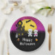 This fun and spooky plate features cute mummies beside a crooked haunted house. In the background is a full moon with bats and a pink night sky with stars. This is perfect for a Halloween party.