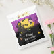 This fun and spooky favour bag features a cute witch beside a crooked haunted house. In the background is a full moon with bats and a purple night sky with stars. The text combines decorative and serif fonts for a stylish and modern look. This is perfect for a Halloween party.
