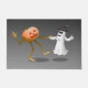 A cute Halloween Doormat with a pumpkin and ghost who have started the costume party and started dancing.