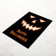 A scary pumpkin face design on a black background. The front has a foil face and "Happy Halloween" with an orange shadow/highlight. The back has an orange pumpkin lantern with a spooky message.