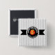 This pinback button design features a Halloween pumpkin on a black label with the text 'Happy Halloween' Personalize with your name or other text. Background is a narrow black and white striped pattern. Search ID212 to see other products with this design.