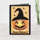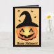 This greeting card design features a cute pumpkin with a witch hat on. The colours are orange and black.The background is a yellow and white mesh with bats flying in the background. So cute for the Halloween season! A great design for kids, teens and adults alike.