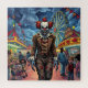 A creepy spooky scary clown walking through a comic book style carnival packed with surprised onlookers! Cool comic book style ai art for those with a dark sense of humour.
