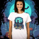 The T-shirt features a haunting Halloween scene set against a dark, starry night. A luminous full moon casts an eerie glow over a desolate cemetery. In the foreground, a creepy scarecrow stands with its back to us, gazing ominously at the moon, creating a spine-chilling atmosphere perfect for the season.