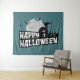 Happy Halloween text design illustration with cemetery and bats decoration at full moon on blue background