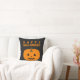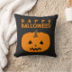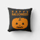A Halloween throw pillow with a pumpkin and a 'Happy Halloween' text on black. Customize the black background color among other options.