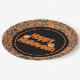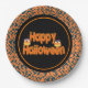 Black and orange paper plates, featuring candy corn witches and cartoon style text.