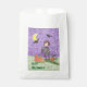 Some fun favour bags for a children Halloween party with the illustration of a witch holding a hat on a purple and green background and the words "Happy Halloween !" written in green letters . © ArianeC Illustrations
