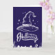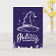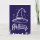 This striking Halloween Greeting Card features a bold, white illustration of a classic witch hat set against a deep purple background. The design is completed with a spooky graveyard scene at the bottom, adding an eerie yet stylish touch. The "Happy Halloween" message is elegantly scripted, making this Greeting Card perfect for sending Halloween greetings or for use as a decorative piece during the spooky season. The minimalist yet impactful design is ideal for those who appreciate a classic Halloween aesthetic.
