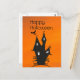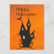 Happy Halloween greeting. Crooked creepy haunted witches house in a black silhouette.