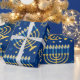 Happy Hanukkah, candles, star of David, Menorah, blue pattern wrapping paper.