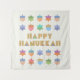 A festive geometric Happy Hanukkah design with colourful dreidels and stars. A modern, non-traditional design with stylized dreidels and Star of David shapes.