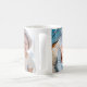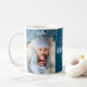 “Happy Hanukkah.” Fun, whimsical handcrafted typography, a random light blue Star of David pattern, and midnight navy blue hand drawn lines overlaying a dark teal blue background, along with 2 photos of your choice, help you usher in Hanukkah. Feel the warmth and joy of the holiday season whenever you use this stylish and modern personalized 2 photo keepsake holiday mug. Matching stickers, pillows, wrapping paper, serving trays, home décor, and more are also available. A great gift for grandparents, as well as yourselves. Make this Hanukkah one to remember!