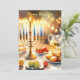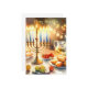 Hanukkah watercolor illustration. A beautifully arranged table set for a festive celebration, featuring a traditional menorah with lit candles. Soft, warm light, while holiday decorations add a touch of cheer. Warm lights creating a cozy, inviting atmosphere.