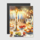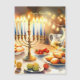 Hanukkah watercolor illustration. A beautifully arranged table set for a festive celebration, featuring a traditional menorah with lit candles. Soft, warm light, while holiday decorations add a touch of cheer. Warm lights creating a cozy, inviting atmosphere.