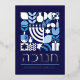 Hanukkah / Chanukah Blue White and elegant Real SIlver Foil. Modern Geometric Pattern Card with Menorah, Dreidel, Doughnuts, Stars  & Olive oil...  Hebrew & Jewish Hanukkah Symbols + Space to add your personalized text on the front & reverse.  Happy Hanukkah wishes.  Hebrew on the front says "Chanukah".  This upscale, beautiful, look, is a great way to wish friends, family, and clients, a very Happy Hanukkah/Chanukah.  If you want to see a variation of this design please message us or email BestDressedBread@gmail.com.