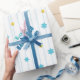 “Happy Hanukkah.” This wrapping paper features a playful, whimsical handcrafted “Happy Hanukkah” custom name typography random pattern in turquoise and green blue, blue and faux gold foil Stars of David, and light aqua blue hand drawn lines, all overlaying a white background. Feel the warmth and joy of the holiday season whenever you use this fun, simple, modern Hanukkah wrapping paper. Personalize with your family name or other greeting. Matching cards, stickers, pillows, home décor, and more are also available. Turns a great present into something even better!