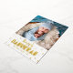 “Happy Hanukkah.” Fun, playful, whimsical handcrafted real gold foil typography and a random Star of David pattern overlay a clean, white background. Add the photo of your choice and help usher in Hanukkah with this stunning, colourful, personalized real gold foil greeting card. Faux gold metallic ombre is on the back. Feel the warmth and joy of the holiday season whenever you send this festive greeting. Your choice of gold, silver, or rose gold real foil. Matching stickers, pillows, wrapping paper, serving trays, home décor, and more are also available. Make this Hanukkah one to remember!