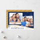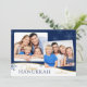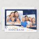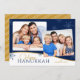 This Hanukkah photo card offers a simple design with 2 photos and the greeting "Happy Hanukkah" appearing in dark blue and gold. The design is accented with light blue snowflakes.