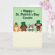 Designed with soft green tones, this digital illustration shows four friendly animal characters lined up across the middle, leaning close together like pals sharing a quiet laugh 💚. An orange cat, a brown dog, a gray cat, and a tan-faced dog peek over a wide cream banner at the bottom, their paws resting along the top edge as if they’re inviting you in. Their big eyes and gentle smiles suggest easy affection and a cozy, companionable mood. Two of them wear green top hats—one with a gold buckle—while the other two sport neat green bow ties, adding a festive touch ☘️. Near the top, an emerald-green holiday greeting is set in thick, easy-to-read letters, with small shamrock shapes tucked around the words. The background fades from pale lime green to a lighter green glow, keeping the scene soft and airy. The cream banner below is left blank for your own note, contrasting clearly against the green backdrop. Tiny shamrock accents sit near the headline, and the hats and bow ties match the same deep green used in the text.