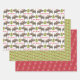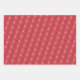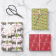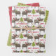 Lovely and modern wrapping paper sheets with three different patterns, the first one featuring some cute cartoon reindeer with green Christmas trees and the wording happy holidays in red lettering on a white background; the second sheet is light green, with white, red, and green polka dots; the third one in red with white, green and red snowflakes
