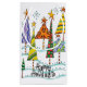 Vintage illustration Merry Christmas holiday design featuring cartoon Christmas trees in a forest in winter with sparkles and snow. These fun and silly trees are decorated with stripes, polka dots, swirls and topped with shining gold stars. Season's Greetings!