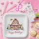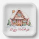 Watercolor Christmas gingerbread man and house with candy canes and Happy Holidays text in snowflakes.