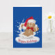 Cute Christmas gingerbread man in white milk splash with Santa Claus cap on a blue background with Happy Holidays text.