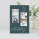 Elegant modern 4 square photos collage winter seasonal greetings card featuring a small hand-drawn copper metallic Christmas tree and a fancy taupe grey "happy holidays" calligraphy script on a dark hunter green background. +++++++++ Personalize with four photos, text and signature on the reverse.