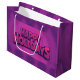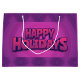 A vibrant purple holiday gift bag with bold "Happy Holidays" text.