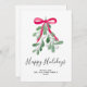 This holiday card is decorated with watercolor green mistletoe, a red ribbon, and stylish script typography that says "Happy Holidays"