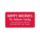 "Happy Holidays" return address labels feature white custom text that can be personalized with a return address and a festive red background.