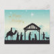 Celebrate the true spirit of Christmas with our “Happy Holidays Nativity Manger Scene” postcard. This elegant postcard features a serene nativity scene silhouetted against a tranquil blue sky that fades into white, symbolizing peace and calm on this holy night. The design includes the holy family, the Three Wise Men, a shepherd with his sheep, and a guiding star shining brightly above. The phrase “Happy Holidays” is written in an elegant script, adorned with small stars to enhance the festive feel. Perfect for sending warm wishes to friends and family or as a thoughtful gift, this postcard will surely leave a lasting impression on anyone who receives it.