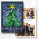 These bright and colourful 5" x 7" flat Christmas greeting cards feature a handmade watercolor stained glass window design of a green Christmas tree with a gold star and red ornaments framed in beautiful shades of blue on a dusty blue background. The greeting is "Happy Holidays," in large decorative letters with an editable greeting, "Wishing you peace, love and joy this holiday season."