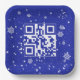 Blue and white QR Code reading Happy Holidays on a blue background with scattered snowflakes.