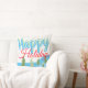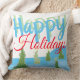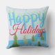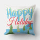 Happy holidays pillow design with trees. Colours are reds, blues and green. The text can be personalized to any message.