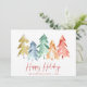 A minimal modern artistic holiday flat card featuring abstract watercolors of Christmas pine trees in gold, red, blue, green and orange. "Happy Holidays" is written in a pretty red script and you can personalize your name and the year.