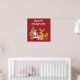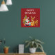 A cute illustration with the holiday spirit. Santa Claus carrying his gift sack and waving hello. His reindeer friend by his side, hanging out by a decorated Christmas tree, with presents all around. Set on a red background with whimsical circles. Festive and cheerful design. Happy Holidays written in a bold blocky white font.