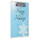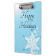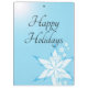 Featuring a blended colour pattern of blue and white with pointed snowflake graphics and a "Happy Holidays" message. Change the text, font, colour, size and placement for the best experience.