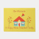 You are a happy home educated family. Show your homeschooling pride today with this unique doormat. This design has a blue house with a red roof. On both sides of the house are orange trees. Above tis a template for entering your family's name. Underneath is "A Happy Home Educated Family" written in trendy font. Place your order today!